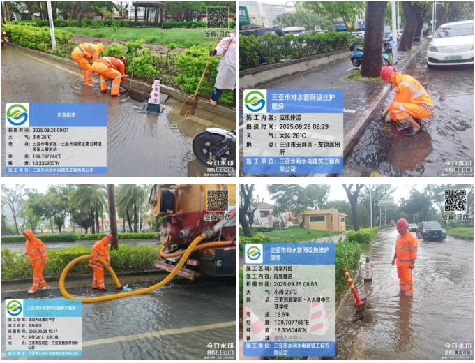 自三亚市启动防汛防风Ⅳ级应急响应起,,,,环农集团迅速调理10辆应急抢险车、组织319名排涝职员时刻待命,,,,分赴各责任路段和重点区域备战。。。。将应急排涝抢险装备及物资已前置到各蹊径指定位置,,,,做好“随取随用”准备。。。。27日下昼,,,,凭证市防风防汛聚会要求,,,,集团派出排涝职员对权属区域窨井盖举行专项巡检,,,,对保存冒溢或移位隐患的井盖实验清静围护,,,,并增设沙袋等增重装备。。。。当晚强风事后,,,,排涝职员连忙冒雨连夜开展排涝作业,,,,始终坚守在岗,,,,一连奋战至28日。。。。
